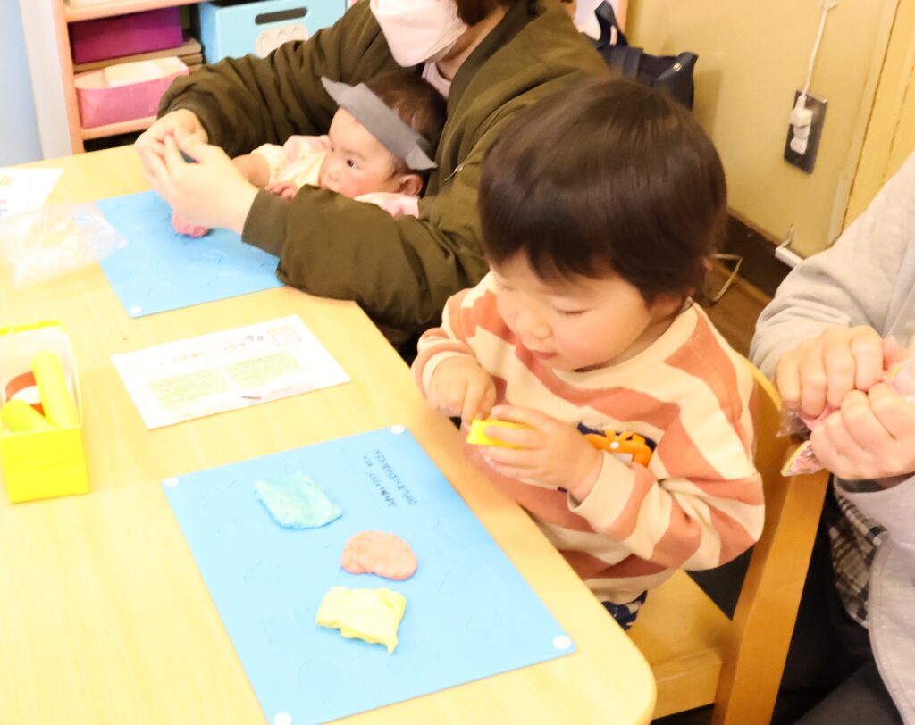赤、青、黄の3色のカラフル小麦粉粘土を合わせたりしながら、感触も楽しんでいました。