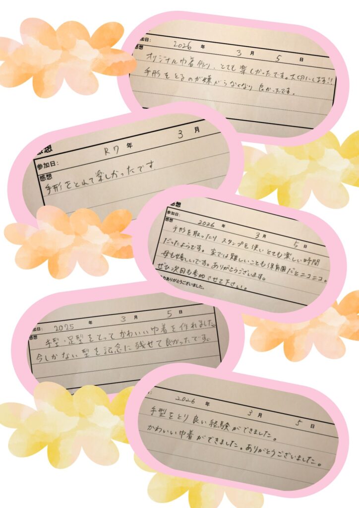 巾着に手形をしたり、お絵描きをしたりして、オリジナル巾着を作りました。オリジナルカレンダーでは塗り絵を楽しみました。