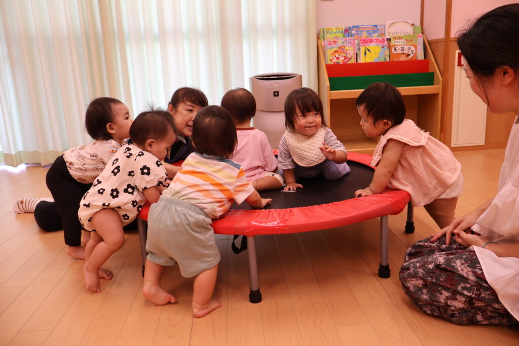 今日の保育所体験に1組2名の方が参加してくださいました。0歳児クラスに入って頂き、園児と保育士が関わる様子を見て頂いたり、園児と一緒に遊び、保育園体験を楽しみました!マットのお山のぼりやトンネルくぐり、トランポリンで体を動かしました。お子さんもハイハイで移動したり、笑顔も見られました!お母様には、離乳食の形態を見て頂いたり、園児が食べる給食試食もして頂きました。